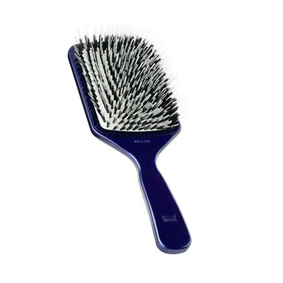 Spazzola con manico ergonomico in materiale plastico e cuscinetto in gomma naturale. Setole in puro cinghiale di primissima qualità con doppio filo in nylon con punte arrotondate, resistente al calore del phon.