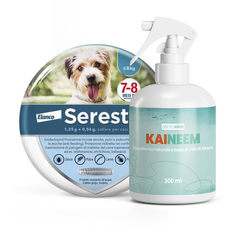 Il kit Seresto Cani + Kaineem è la soluzione ideale per garantire al tuo cane piccolo una protezione completa e a lungo termine contro i parassiti, unita a una cura naturale per il suo manto. Questo set combina l’efficacia del collare antiparassitario per cani piccoli di ultima generazione Seresto con il potere delicato e protettivo del repellente naturale per cani e gatti Kaineem, offrendo un approccio olistico al benessere del tuo amico a quattro zampe. Prevenire pulci e zecche non è mai stato così semplice e delicato.